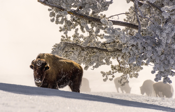 A Bison stands in heavy snow under an evergreen tree on a cold winter day as the herd searches for food.