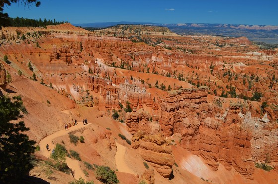 People hiking trails among the hoodoos and red sandstone walls and floor of Bryce Canyon National Park