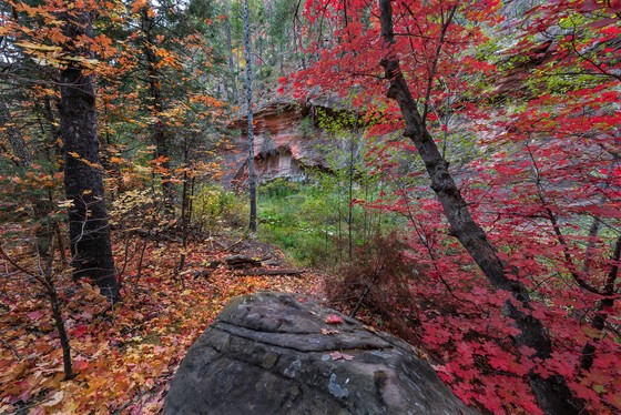The beautiful fall colors of the West Fork of Oak Creek Canyon. Near the red rock town of Sedona. Shear vertical canyon walls encase this lush riparian area. The Forest Service showcases this spectacular canyon offering visitors a memorable experience.