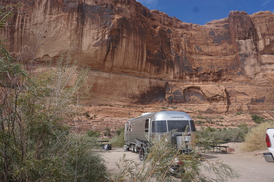 Camping in our Airstream along the Colorado River in Moab, Utah with the red Wingate cliffs of Arches National Park as a backdrop. This was taken at Goose Island Campground which is maintained by the BLM.