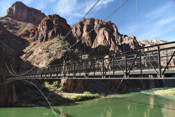 Suspension Bridge across the Colorado River. All materials were carried down by hand and mule. 42 Havasupai were hired to snake down the 550 suspension cables from the rim.