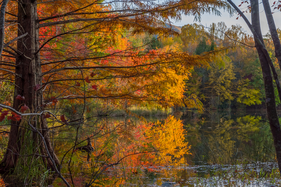 Fall colors at Indian Boundary Lake. Cypress tree and the evening sun hitting the beautiful colors in the background.
