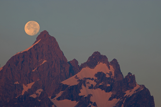 A nearly full moon passes by the summit of Grand Teton in Grand Teton National Park.