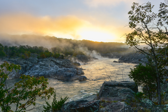 The early morning sun breaking through a thick layer of fog at Fishermans Eddy. This image was taken from Overlook 2 on the Virginia side of the park. If you look closely, you can see three individuals fishing along the rocks.
