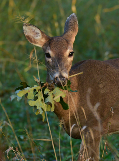A whitetail deer munching on an oak twig in Great Falls Park.