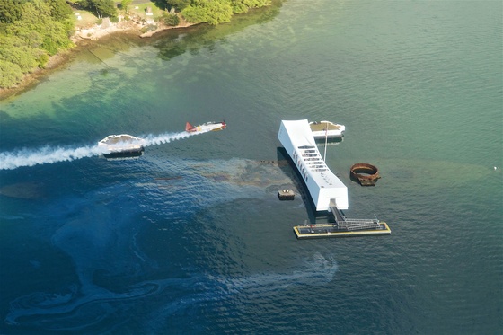 I was taking a flightseeing helicopter ride around the Hawaiian island of Oahu. When we were passing over Pearl harbor a small plane was flying over the USS Arizona Memorial and I was fortunate to capture this image.This is a National Historic Monument.