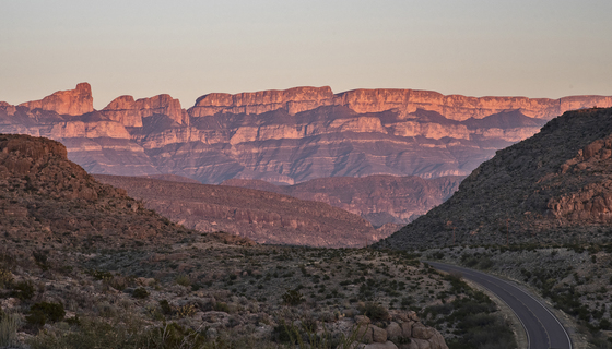 Road heading east as sun turns the Sierra del Carmen a bright red/orange. Sun Washed Cliffs.