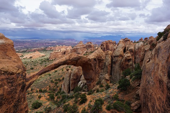 Arches National Park - Landscape Arch. Snow falls on the Manti la Sal mountains, while rain hits Castle Valley. Arches NP remains dry.. for now...