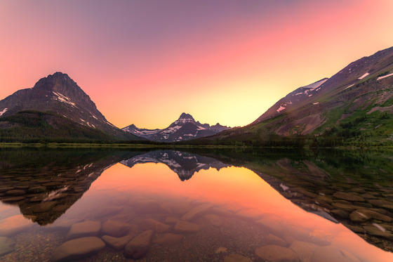 This was shot at Swiftcurrent lake, Glacier National Park, Montana, USA. This was one of the most breathtaking sunsets I've ever seen and the whole sky lit up orange and pink despite the lack of clouds.