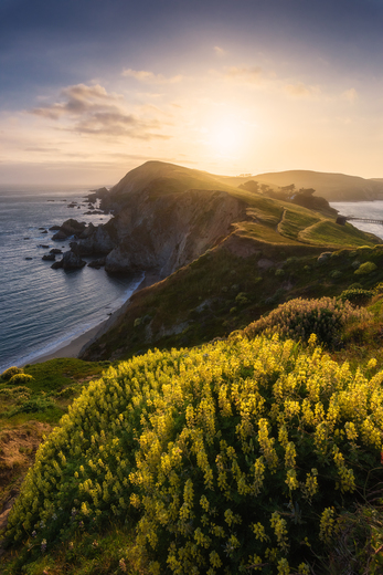 An abundance of yellow lupine and a gorgeous setting sun at Point Reyes National Seashore.