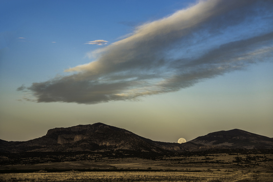 Moonset, Rio Grande National Forest: This image was taken in September 2018 about 12 miles north of Del Norte, CO. in Saguauche County. I originally planned the morning to photograph a historic church a couple mines away with moon setting behind the church (which I did). As I was leaving I noticed the moon setting just above the foothills of the National Forest and got out to capture this image. I used a Nikon D800 camera with a 28-300 mm Nikkor lens.