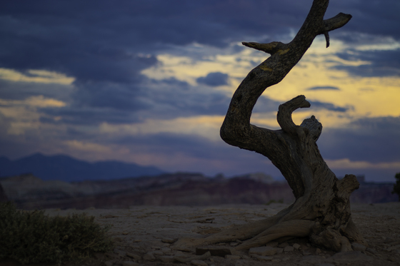 The twist of the tree and colors in the sky this picture makes stop and be still. Love it!