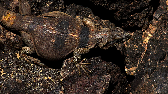 The chuckwalla lizard blends in very well with the desert environment where it lives. It stores fat along its sides and in its tail.