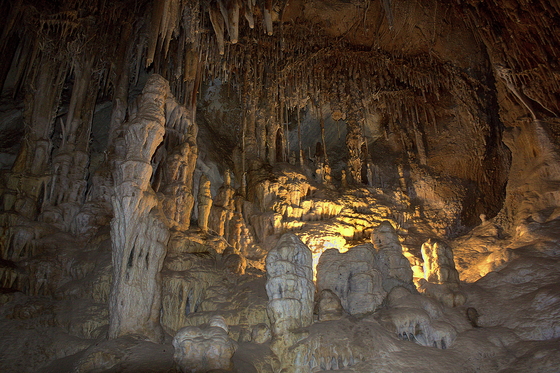The speleothem features: soda straws. stalactites, stalagmites, and columns; in Lehman Cave, a solution cave located in Great Basin National Park.