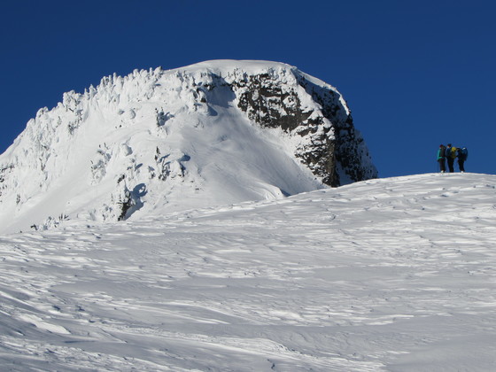 Skiers contemplate lines below Table Mountain