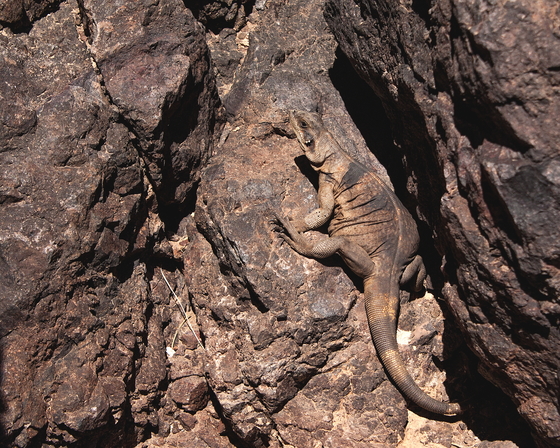 The chuckwalla lizard is the largest lizard in the California desert. It stores fat along its sides and in its tail. It blends in well with the rocky areas where it prefers to live. When threatened by a predator, it will wedge itself into a rock crevice and inflate its body so it can't be dislodged.