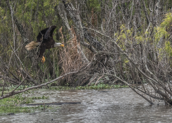 American Bald Eagle on the Hunt. Here's a picture of "ABE" flying through the swamp. Claws down he's going in for his prey. A majestic sight to see in person.