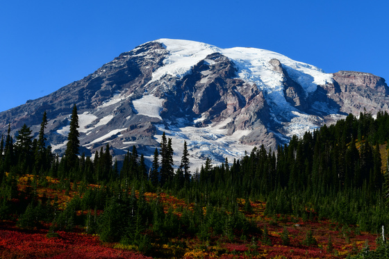 I've heard of how amazing Mount Rainier is during the spring and summer with the wildflowers in bloom, but I was pleasantly surprised by how beautiful it is in the Fall, too! So many bright reds and yellows that stuck out against the dark green trees!