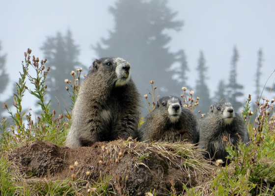 Three Amigos Three Marmots at Mt. Rainier National Park observing the visitors near Myrtle Falls.