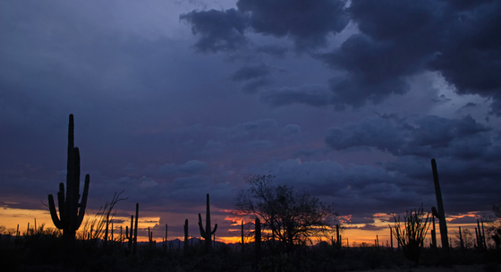 Storms are Brewing--Monsoon storm building up with subsequent clouds at sunset over the desert, with saguaro cacti in silhouette