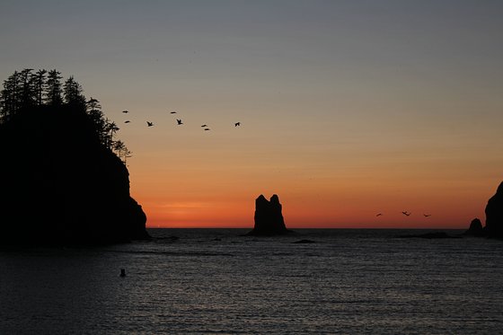 Over the last two years my parents and I have been full-time RVing, and have visited more than half the National Parks in the US. Each one is breathtakingly beautiful, and uniquely special. In this photo, pelicans and other birds cross the silhouetted islands and watercolor sky of a sunset over La Push/First beach on the coast of Washington