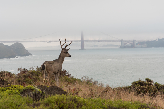Black-tailed deer buck overlooking his San Francisco Bay domain. I shot this photo in Golden Gate National Recreation Area in the Marin Headlands portion of the park. I came across this buck and several doe feasting on breakfast. Right after I arrived, this buck posed perfectly overlooking the bay and I was fortunate enough to capture this photo of that scene.