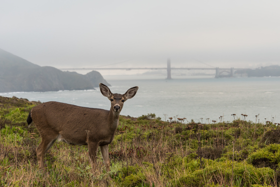 Doe and her San Francisco Bay domain. I was photographing in Golden Gate National Recreation Area in the Marin Headlands portion of the park and came upon several black-tailed deer does and a buck. They were busy feasting on breakfast and this doe posed for me as pictured.