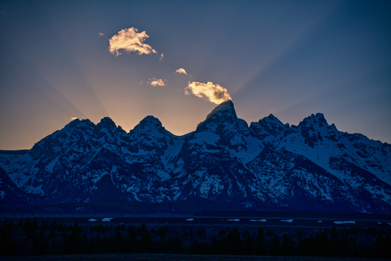 The last remnants the day's sun leaving a few beams of light over the Grand Tetons and Wyoming sky.