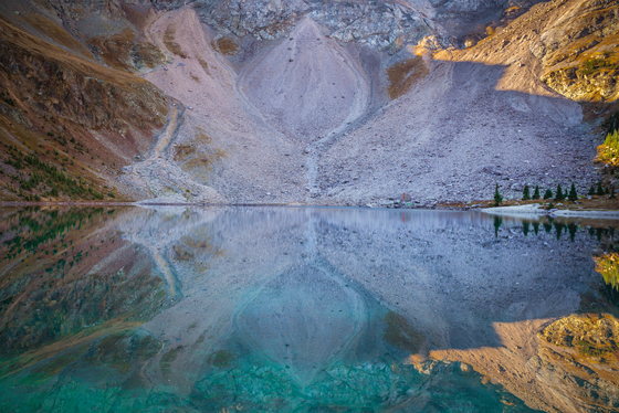 After a moonlit hike up to see the sunrise above the tree line, I descended down to the base of the lower lake to get a different perspective while the sun is still barely breaking into the valley. I love the abstract organic nature of the curvy lines formed by the glaciation process of the past. Not to mention the stillness of the turquoise alpine lake providing that crisp reflection. A peaceful morning indeed.