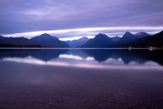 A gloomy late evening shot of Lake Mcdonald on what would be one of the last remaining days of 2018 that the Going to the Sun Road would be open. Light from vehicles leaving the park can be seen on the right.