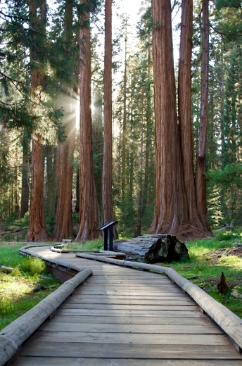 Sun beams filtering through giant Sequoias