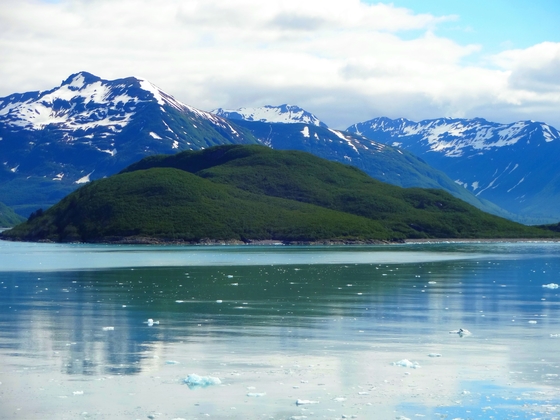 Surrounding mountains border the coast in Glacier Bay. The clearness of the water really emphasized the brilliant bright colors of the icebergs.