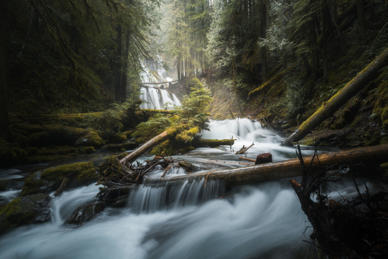 The first light of the day breaks over the trees illuminating the cascading creek below.