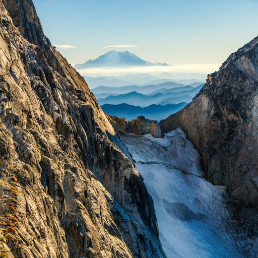 Reaching this vantage point of Mount Rainier framed between two peaks required ascending thousands of feet of technical multi-pitch climbing up a soaring granite face.