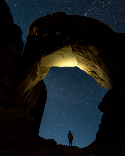 Discovering a new window to the stars in Arches National Park while illuminating the massive arch with my headlamp.